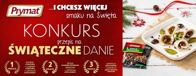 Załóż konto lub zaloguj się w serwisie DoradcaSmaku.pl i dodaj swój autorski przepis oraz zdjęcie na świąteczne danie (nie deser), w którym jednym ze składników jest przyprawa marki Prymat.