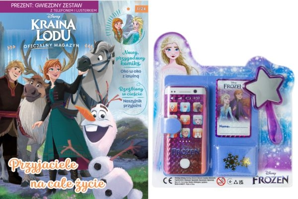 Uwaga! W każdym numerze czeka na Was prezent – zestaw do zabawy, rysowania lub śpiewania. A w tym numerze Krainy Lodu znajdziecie Gwiezdny zestaw z telefonem i lusterkiem!