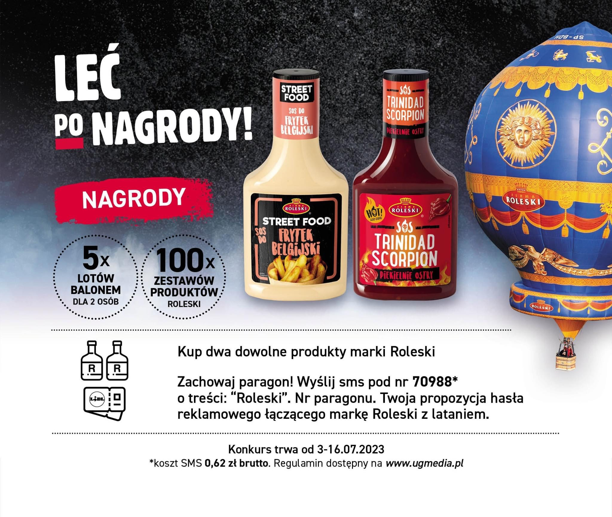 W dniach 3-16 lipca kupić dwa dowolne produkty Roleski w jednym ze sklepów Lidl, wymyślić hasło łączące markę Roleski z lataniem i wysłać zgłoszenie na nr 70988 (Szczegóły na grafice).Nie zapomnijcie zachować paragonu!