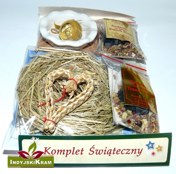 9x minizestaw na Wigilię i Święto Trzech Króli (zestaw zawiera: ozdobę na choinkę, minikadzielniczkę z podstawką, kadzidło na Trzech Króli z kredą i węgielkiem, sianko na stół, opłatki, opis tradycyjnej polskiej Wigilii, teksty trzech kolęd, składaną szopkę tekturową)