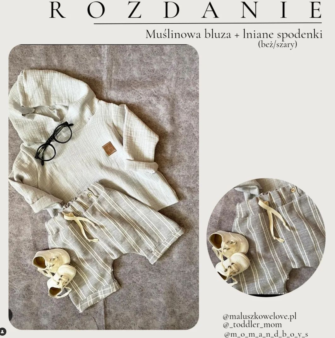 zestaw bluza muślinowa + lniane spodenki w wybranym kolorze beż/szary
