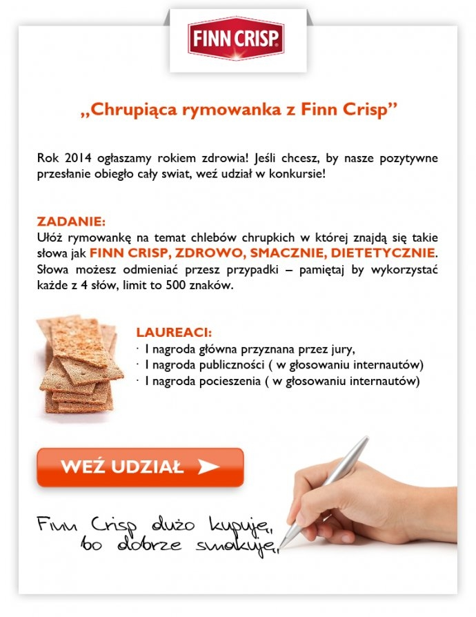 Ułóż rymowankę na temat chlebów chrupkich Finn Crisp, w której znajdą się takie słowa jak FINN CRISP, SMACZNIE, ZDROWO, DIETETYCZNIE. Słowa możesz odmieniać przez przypadki - pamiętaj jednak, by wykorzystać każde ze słów. Limit znaków 500.