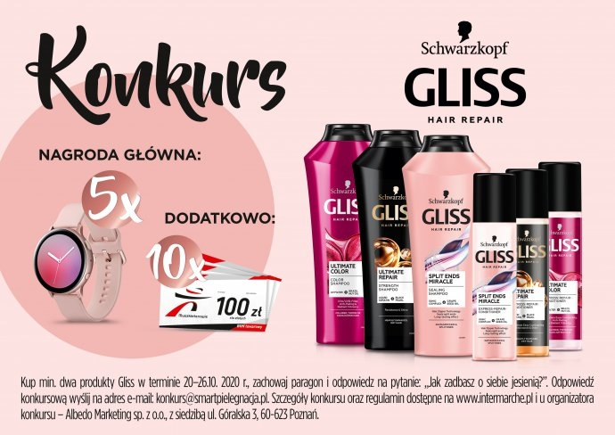 Warunkiem uczestnictwa w Konkursie jest dokonanie w czasie trwania Konkursu w sklepie sieci Intermarche na terenie Rzeczypospolitej Polskiej jednorazowo zakupu min. 2 produktów marki Gliss i wysłanie zgłoszenia do Konkursu na adres konkurs@smartpielegnacja.pl