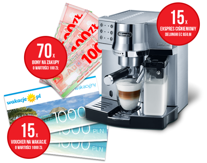 a) 15 nagród I stopnia w postaci ekspresu ciśnieniowego Delonghi EC 850.M