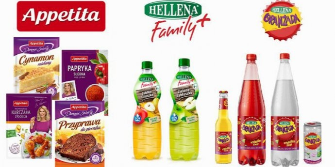 pięć zestawów Oranżad Hellena, napojów Hellena Family+ oraz ziół i przypraw Appetita