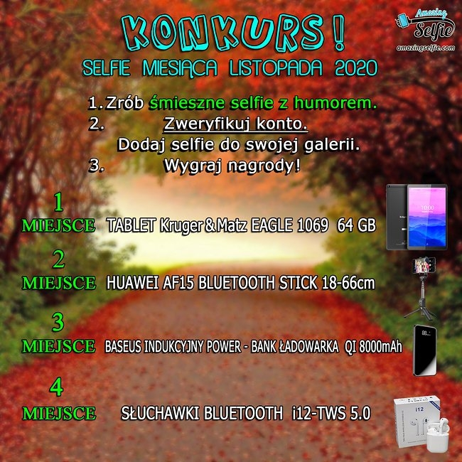 Dołącz do społeczności, zweryfikuj swój profil, dodaj śmieszne selfie z humorem i wygraj jedną z nagród! Zdjęcia dodane w czasie trwania konkursu będą nominowane oraz oceniane w konkursie przez Jury. Spośród zdjęć biorących udział w konkursie zostanie nominowane max 50 zdjęć, które zostaną ocenione pod kątem: