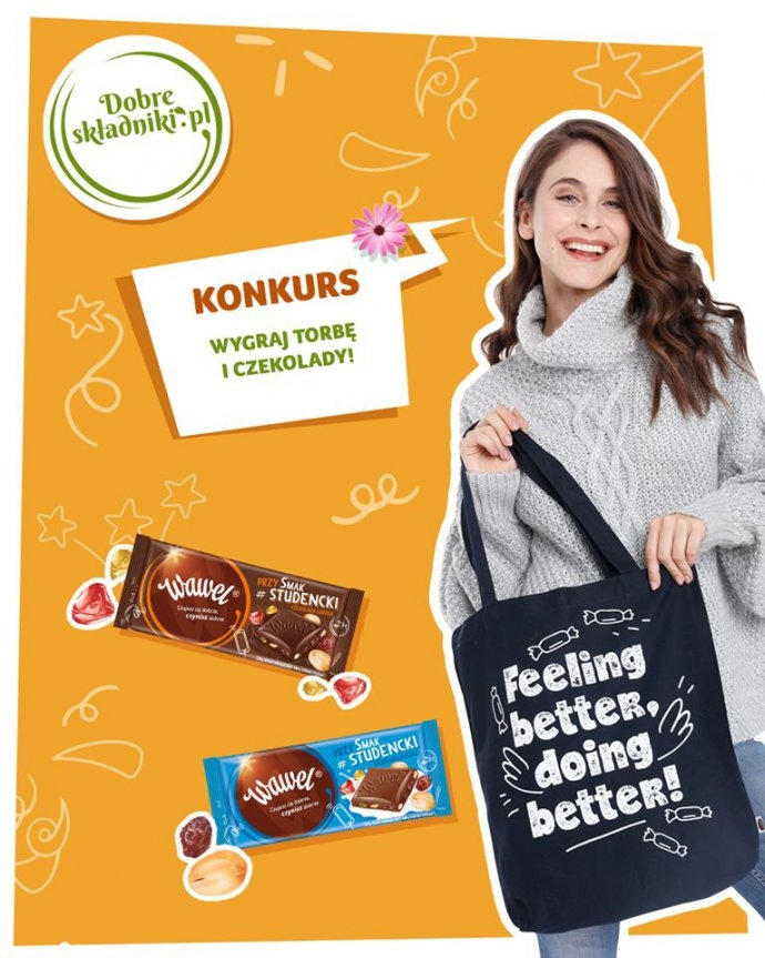 Torba „Feeling better, doing better” o wartości 15,00 zł (słownie piętnaście złotych 00/100) oraz 16 szt Przysmak Studencki Czekolada Gorzka 100g, 16 szt Przysmak Studencki Czekolada Mleczna 100g o łącznej wartości 137,76 zł (słownie: sto trzydzieści siedem złotych 76/100) wraz z kwotą pieniężną w wysokości 17 zł (słownie: siedemnaście złotych 0/100), to jest Nagroda o łącznej wartości 169,76 zł (słownie: sto sześćdziesiąt dziewięć złotych 76/100).