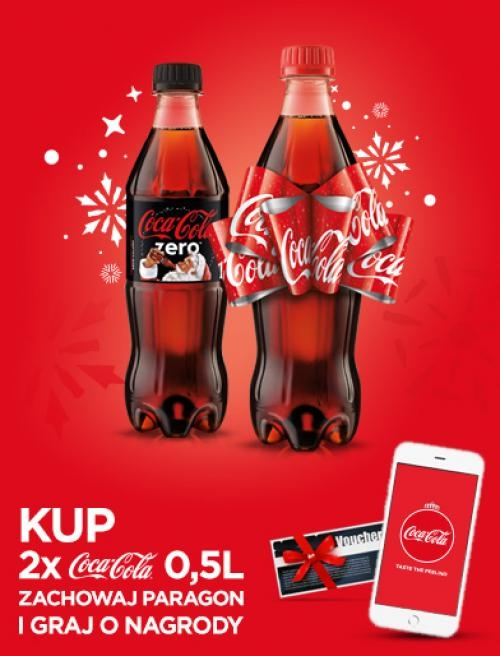- dokonanie zakupu minimum dwóch butelek spośród: Cooca-Cola 500 ml, Coca-Cola Zero 500 ml, Fanta 500 ml, Sprite 500 ml, Nestea 500 ml, Cappy 330 ml, Burn 250 ml