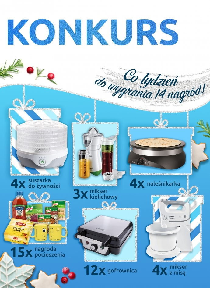 - od 8.12 do 14.12.2020 r. do wygrania 4 naleśnikarki marki Unold - III miejsce: co tydzień do wygrania 4 gofrownice marki Camry