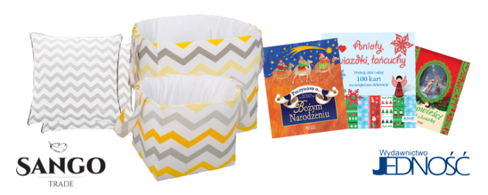 4 nagrody główne (kosz na zabawki SANGOTRADE i książka Wydawnictwa Jedność),