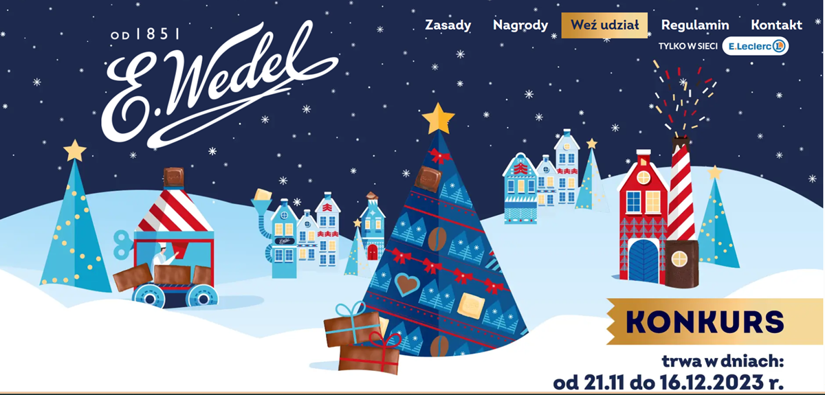 - Kup w sieci sklepów E.Leclerc produkty Wedel (z wyjątkiem cukierków sprzedawanych luzem, to jest na wagę) za minimum 15 zł.