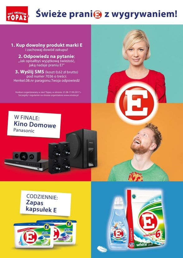 Kup w Topaz dowolny produkt marki E, zachowaj paragon.Odpowiedz na pytanie:"Jak opisałbyś wyjątkową świeżość, jaką nadaje praniu E?"