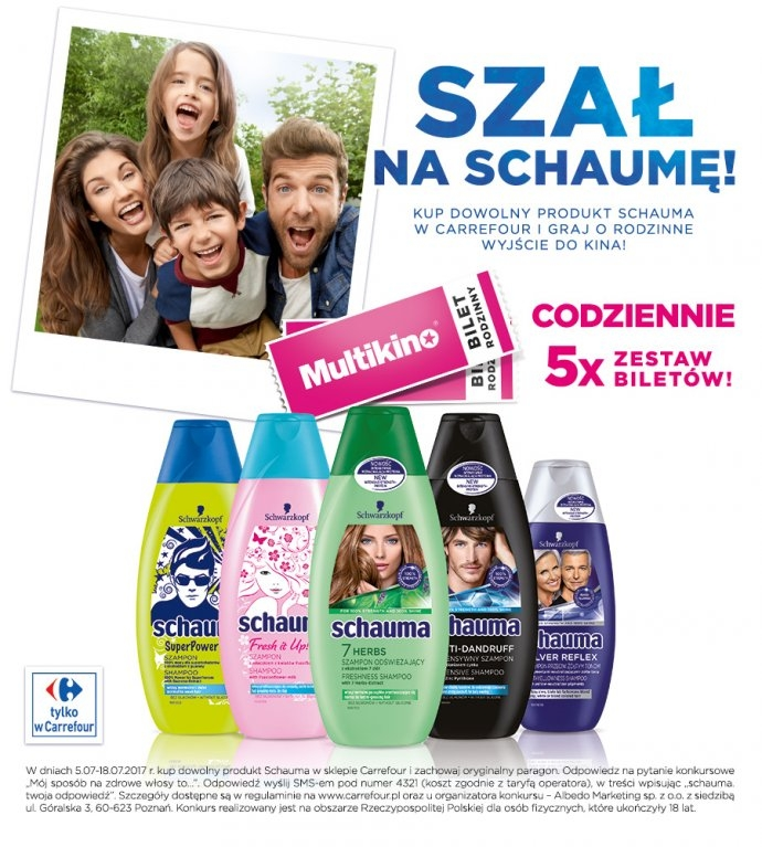 Kup dowolny produkt Schauma w wybranym markecie Carrefour, odpowiedz na pytanie konkursowe: "Mój sposób na zdrowe włosy to..." Odpowiedź wyślij według wzoru: SCHAUMA. odpowiedź na numer 4321