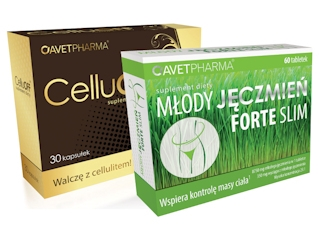 wyszczuplające zestawy suplementów diety od Avet Pharma. W skład zestawu wchodzi CelluOFF i Młody Jęczmień Forte Slim.