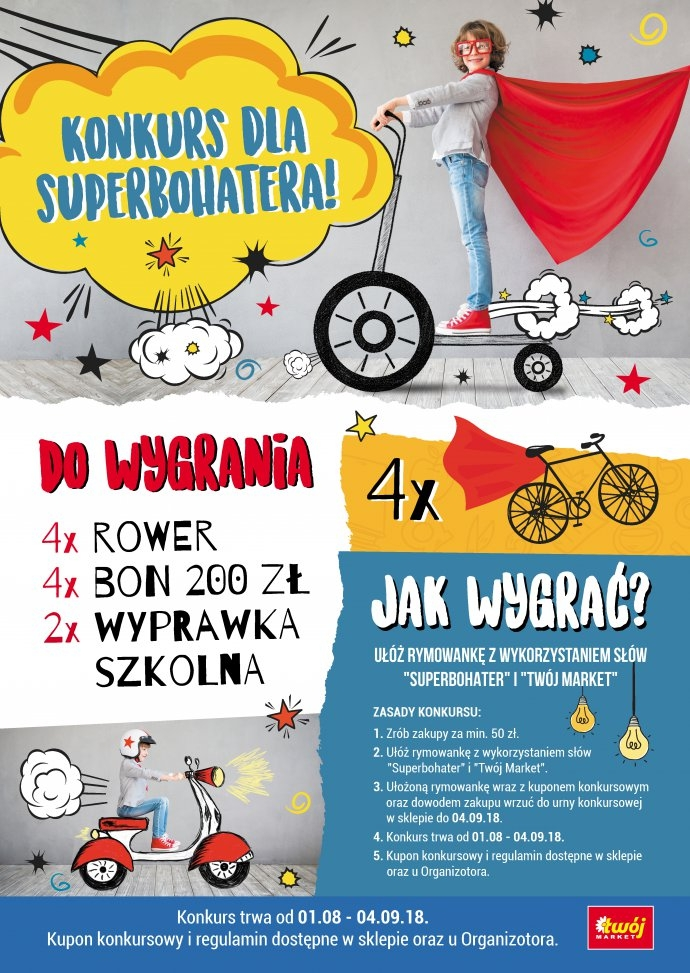Ułóż rymowankę z wykorzystaniem słów „Superbohater” i „Twój Market” - na kuponie konkursowym , dostępnym w placówce Twój Market