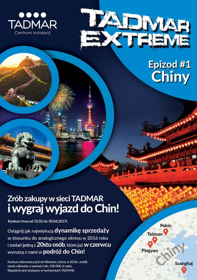 Konkurs „Tadmar Extreme – Chiny” ma na celu nagrodzenie 20 Uczestników, którzy w okresie od dnia 15.02.2017 do 30.04.2017 roku osiągnęli największą dynamikę sprzedaży w odniesieniu do analogicznego okresu roku poprzedniego (tj. w odniesieniu do okresu od 15.02.2016 do 30.04.2016) w zakresie produktów oferowanych przez Tadmar. Konkursem objęte są wszystkie produkty dostępne w sieci Tadmar w Polsce.