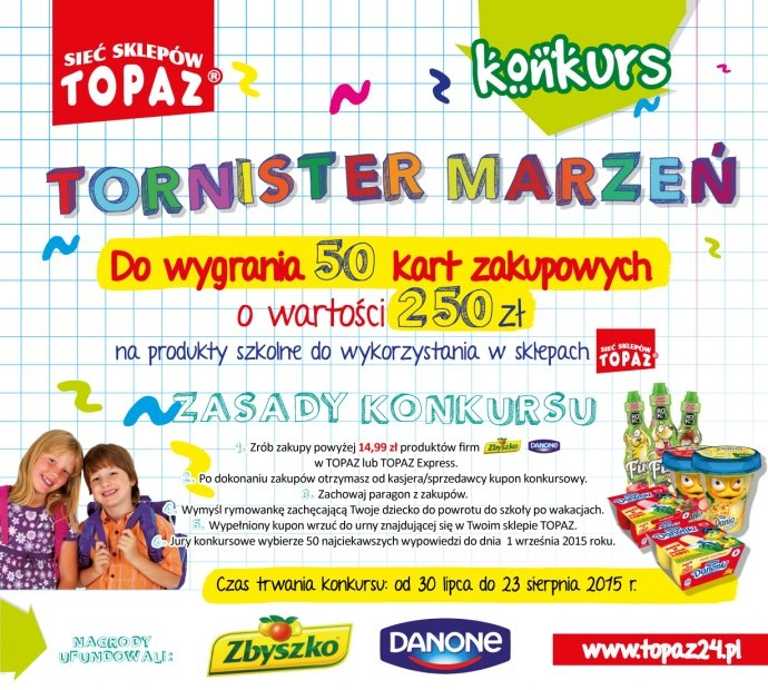 Zrób zakupy powyżej 14,99 Zbyszko i danone w topaz lub topaz express. W kasie otrzymasz kupon. Wymyśl rymowankę zachęcającą Twoje dziecko do powrotu do szkoły i wrzuć go do urny.