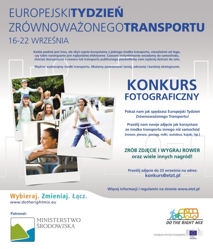 Każdy, kto w ciągu trwania Europejskiego Tygodnia Zrównoważonego Transportu (16-22.09), prześle zdjęcie pokazujące w jaki sposób obchodzi to święto transportu, może wygrać rower miejski oraz wiele innych nagród. Wystarczy zrobić zdjęcie wybierając środek transportu inny niż samochód (rower, pieszo, pociąg, rolki, autobus, kajak, itp.).