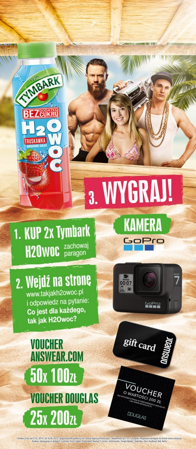 Od 1 maja do 30 czerwca 2019 r. w sklepach spośród następujących sieci: Carrefour, Tesco, Żabka, Polomarket, Auchan, E.Leclerc, Intermarche, Simply Market, Stokrotka, Dino, Kaufland, Aldi, Netto trwa konkurs " Jak H2Owoc".