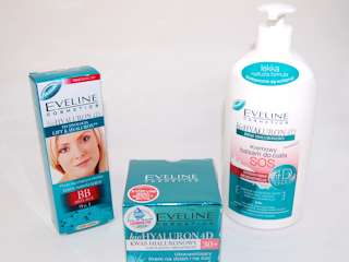 Zestaw Eveline Cosmetics. W skład zestawu wchodzą: Ultranawilżający krem na dzień i na noc 30+ bioHyaluron 4D, Krem BB bioHyaluron 4D, Kremowy balsam do ciała SOS bioHyaluron 4D.