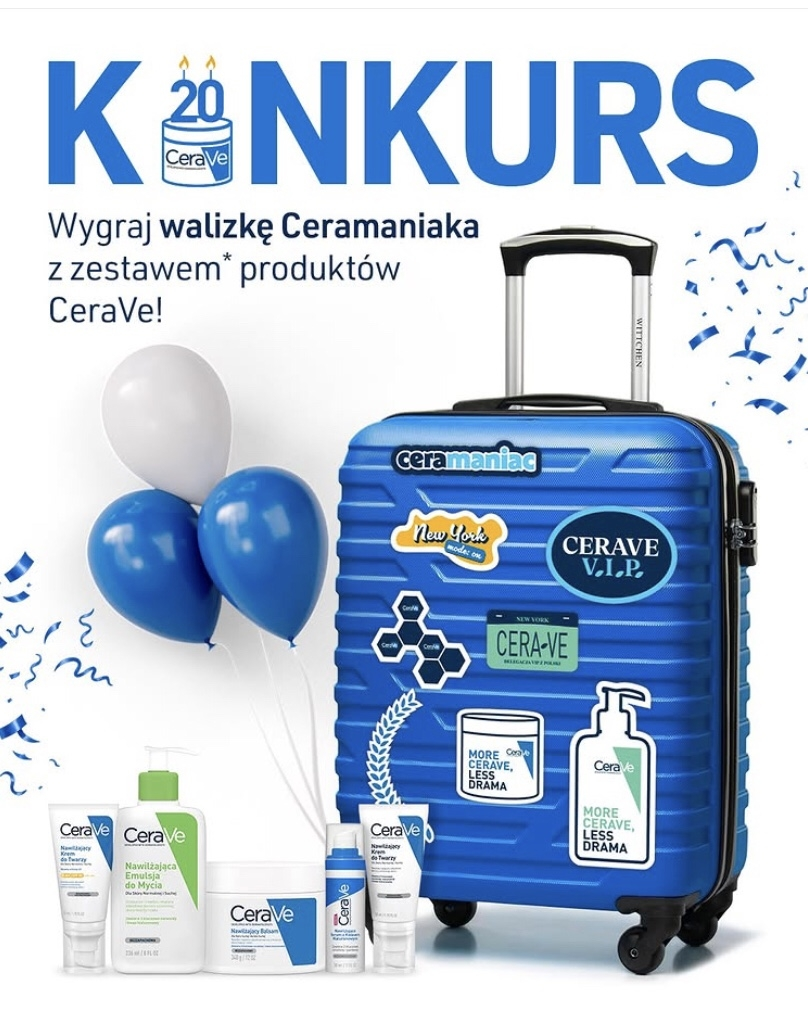Zestaw składający się z: walizki podróżnej marki Wittchen (rozmiar S, kolor: niebieski), ceramaniakowych naklejek na walizkę i pięciu produktów CeraVe: 1 sztuka CeraVe Nawilżająca Emulsja do Mycia (236ml), 1 sztuka CeraVe Nawilżający Krem do Twarzy SPF 50 (52ml), 1 sztuka CeraVe Nawilżający Krem do Twarzy (52ml), 1 sztuka Nawilżające Serum z Kwasem Hialuronowym, 1 sztuka Nawilżający Balsam (340 g). Wartość jednej nagrody to 665,65zł brutto.