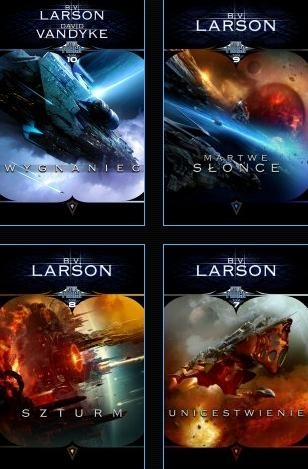zestaw czterech najnowszych tomów z serii Star Force autorstwa B.V. Larsona oraz duetu B.V. Larson & David VanDyke wydanych przez wydawnictwo Drageus (komplet tytułów SF 7-10, czyli "Unicestwienie", "Szturm", "Martwe słońce" oraz "Wygnaniec")