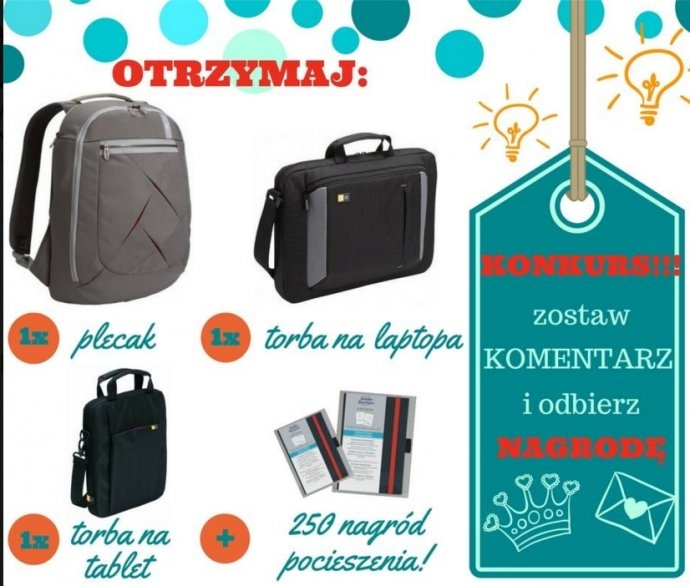 Do autorów trzech najciekawszych komentarzy wyślemy następujące nagrody: kolejno – 1.PLECAK wraz z zestawem notatnik Notizio + długopis; 2.TORBA NA LAPTOPA wraz z zestawem notatnik Notizio + długopis; 3.TORBA NA TABLET wraz z zestawem notatnik Notizio + długopis. Autorzy kolejnych 50 najciekawszych komentarzy otrzymają po zestawie: notatnik Notizio w twardej oprawie + długopis. Autorzy kolejnych 200 ciekawych komentarzy otrzymają po zestawie: mały notesik Notizio z wyrywanymi karteczkami + długopis.