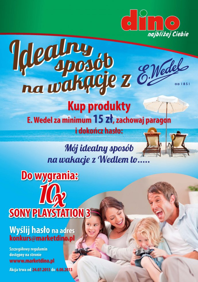 Prawidłowe zgłoszenie udziału w Konkursie polega na wysłaniu przez Uczestnika wiadomości email na adres: konkurs@marketdino.pl w terminie od 24.07.2013 roku do 13.08.2013 roku, zawierającą dokończenie zdania „Mój idealny sposób na wakacje z E.Wedel… ” oraz następujących danych: imię, nazwisko, adres zamieszkania, numer telefonu, nr paragonu poświadczającego zakup produktów E.Wedel na kwotę minimum 15 pln brutto