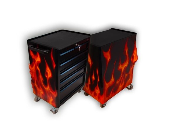 wózek Warsztatowy z grafiką żywych ogni, wykonaną przez FHU AEROGRAF Piotr Parczewski.