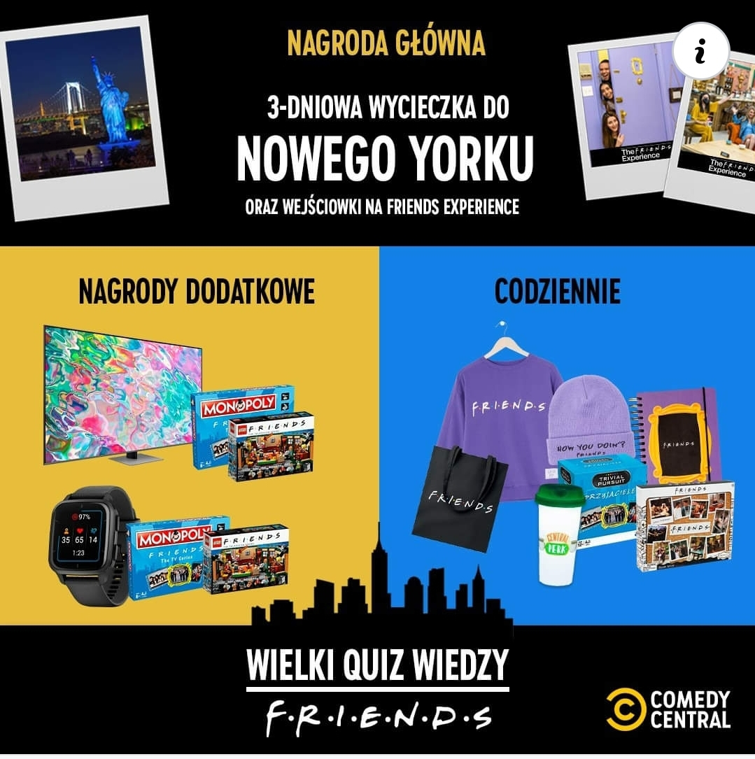 - 1 miejsce (najwięcej poprawnych odpowiedzi przez cały okres trwania konkursu): wyjazd z osobą towarzysząca do Nowego Jorku na Friends Experience