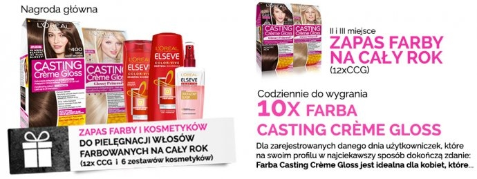 2 nagrody, każda w postaci zestawu 12 sztuk farb Casting Crème Gloss L’Oréal Paris 270 nagród dziennych w Konkursie, każda w postaci jednej farby Casting Crème Gloss marki L’Oréal Paris