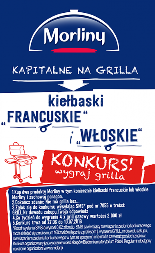 Aby wziąć udział w konkursie należy kupić w sklepie Biedronka minimum dwa produkty marki Morliny (w tym koniecznie kiełbaski francuskie lub włoskie), a następnie wysłać SMS pod numer 7055 z jak najciekawszym dokończeniem zdania "Nie ma grilla bez...". Wzór prawidłowo wysłanego SMS-a jest następujący: GRILL.numer paragonu.dokończenie zdania