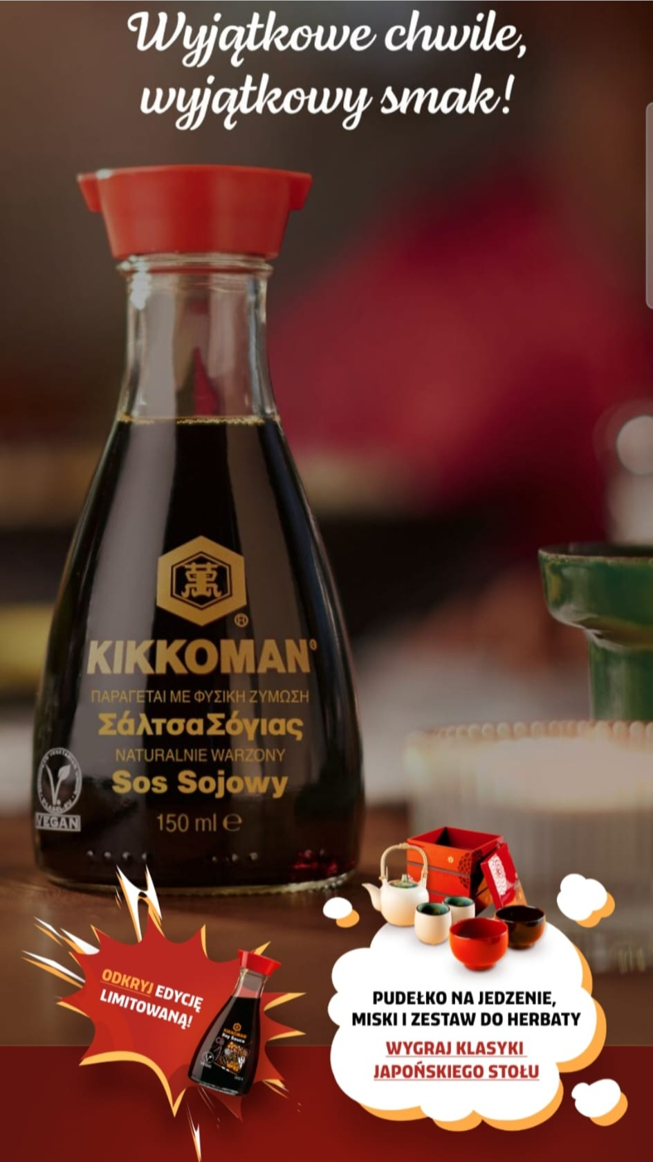 - Nagroda czwarta przyznana 5 Laureatom: nagroda rzeczowa w postaci zestawu 3 produktów Kikkoman o łącznej wartości 50 złotych brutto. Zestaw produktów składa się z sosu sojowego w buteleczce limitowanej edycji oraz dwóch produktów niespodzianek.