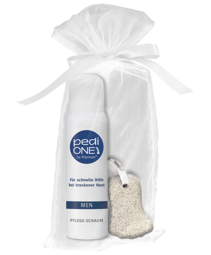 super zestaw pielęgnacyjny, który składa się z nawilżającego kremu w piance do męskich stóp oraz pumeksu.