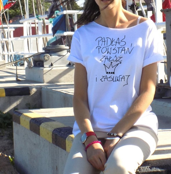 koszulka w kolorze białym fason – nie taliowany, luźny - motyw do wyboru z całej oferty AK-Creativo w wybranym przez zwycięzcę rozmiarze