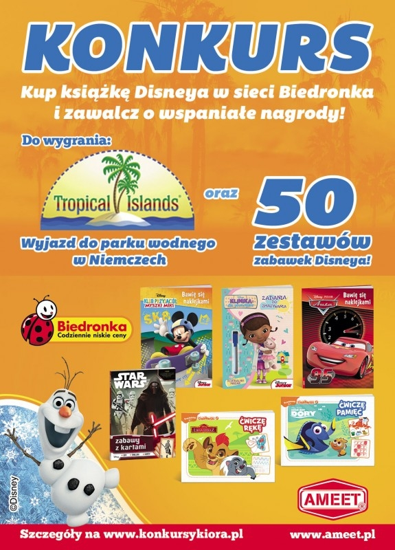 Należy zakupić w sieci sklepów Biedronka książkę na licencji Disneya lub Star Wars wydawnictwa Ameet, wykonać pracę konkursową polegającą na ciekawej odpowiedzi na pytanie: Jak chciałbyś spędzić wymarzone wakacje?”