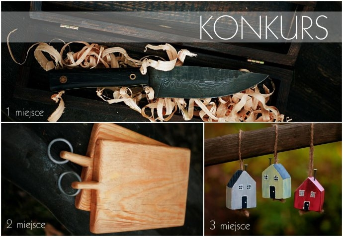 trzy nagrody - ręcznie kuty nóż ze stali damasceńskiej, z rękojeścią z czarnego dębu razem z drewnianym pudełkiem, zestaw dwóch desek modrzewiowych z kutymi kółkami oraz zestaw 3 ozdób na choinkę - Domki.