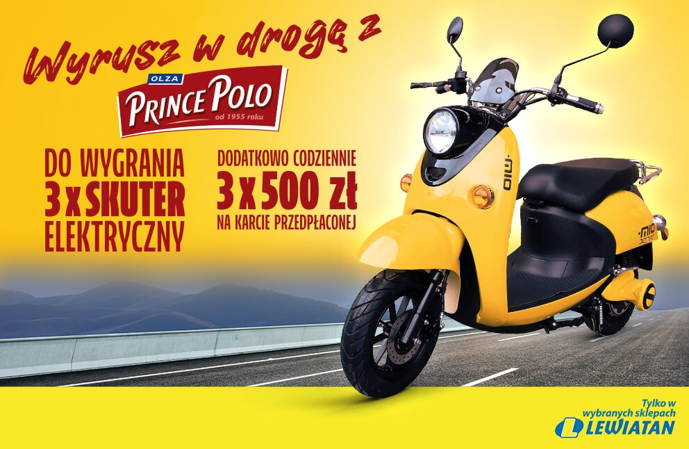 Kup dowolny/-e Produkt/-y Prince Polo w sklepie Lewiatan objętym promocją.Zachowaj paragon fiskalny, będzie niezbędny do zgłoszenia udziału i odbioru nagrody.Wykonaj zadanie konkursowe: Napisz: Gdzie udasz się na pierwszą wiosenną przejażdżkę nowym skuterem. (maks. 400 znaków).