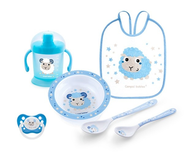 dwa zestawy BUNNY&COMPANY: kubeczek niekapek, smoczek uspokajający, miseczka, sztućce, śliniaczek