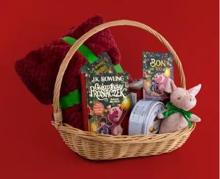 - 7x kosz zawierający: koc ze złotym haftem, książkę „Gwiazdkowy Prosiaczek” (twarda oprawa), kalendarz 2022 „Mały Poradnik Życia”, pudełko ciasteczek, świąteczną herbatę oraz maskotkę.