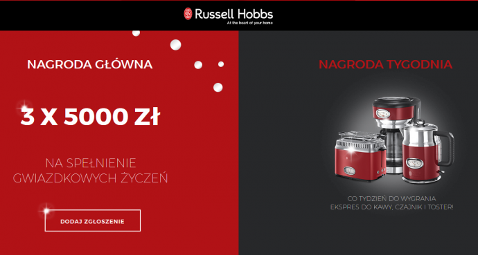 Nagrody tygodniowe: 30x zestaw Russell Hobbs RETRO Ribbon Red, w skład którego wchodzi ekspres do kawy, czajnik i toster, o wartości 1007 zł