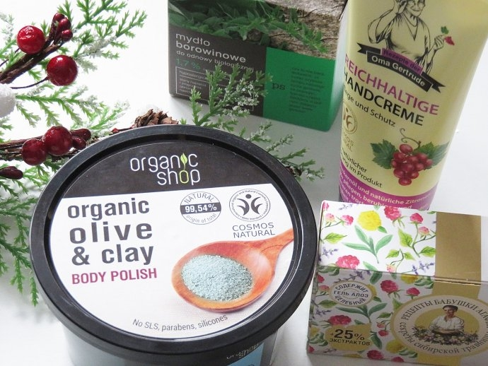 zestaw nr 1: Organic Shop, peeling do ciała niebieska glinka; Tołpa, mydło borowinowe do odnowy biologicznej; Babuszka Agafia, nawilżający krem do twarzy z jonami srebra; Oma Gertrude, nawilżający krem do rąk – winogrono i cytryna.
