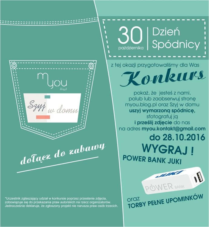 Konkurs zorganizowany został z okazji Dnia Spódnicy. Zadaniem uczestnika jest stworzenie spódnicy według własnego projektu, przesłanie zdjęcia na podany adres e-mailowy (myou.kontakt@gmail.com) oraz polubienie stron/zaobserwowanie stron organizatorów - myou oraz Szyj w domu.