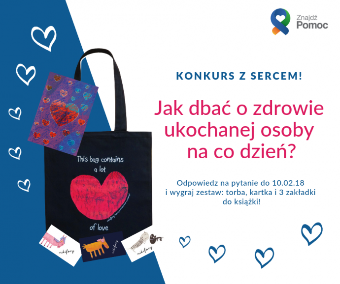 5 pakietów z sercem: torba czarna "This bag contains a lot of love", kartka z sercem, 3 zakładki do książek z kolekcji "Nikifory". Wszystkie nagrody pochodzą z charytatywnego sklepu Fundacji.