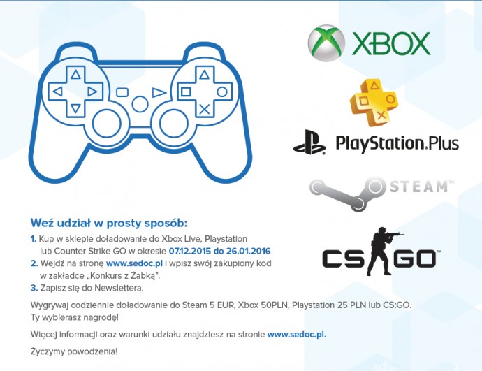 Kup w sklepie Żabka dowolne doładowanie do XBOX LIVE, PLAYSTATION lub COUNTER STRIKE GO i wygrywaj codziennie kody (Steam 5 EUR, Xbox 50 PLN, Playstation 25 PLN lub CS:GO).