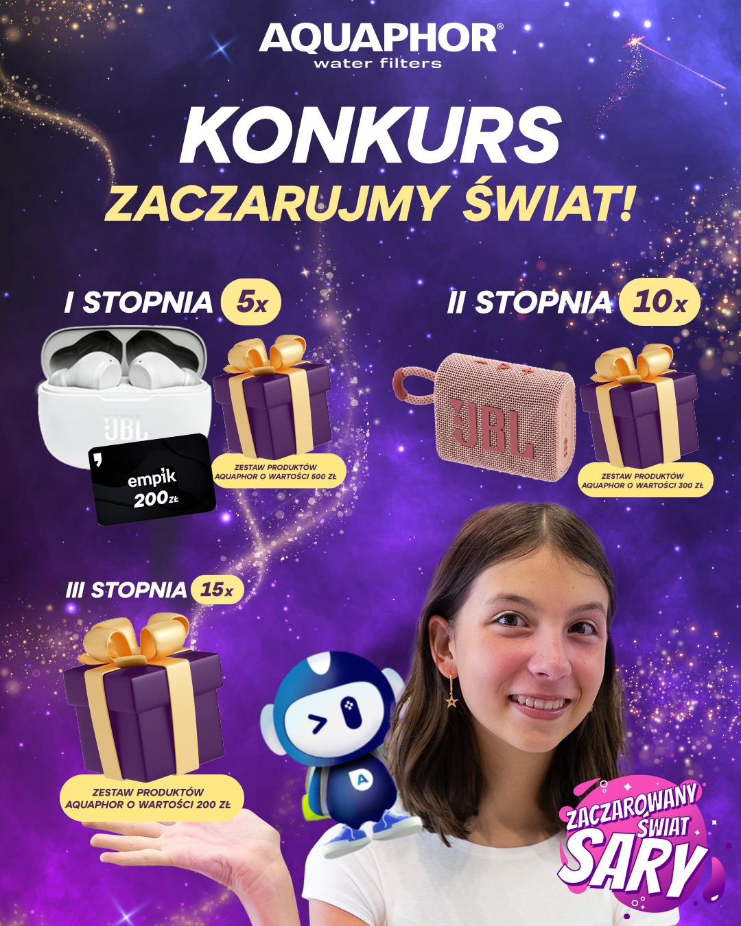 - 5x nagroda I stopnia - bezprzewodowe słuchawki JBL VIBE BEAM + karta podarunkowa EMPIK o wartości 200 zł + zestaw produktów AQUAPHOR o wartości 500 zł