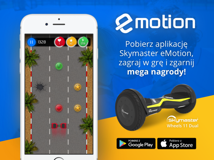 Pobierz aplikację Skymaster eMotion i zagraj w grę. Sprawdź, jak radzisz sobie z pokonywaniem przeszkód podczas jazdy Wheelsem. Do wygrania elektryczne deskorolki Wheels 11 i 6,5 Dual, a także głośniki bezprzewodowe.
