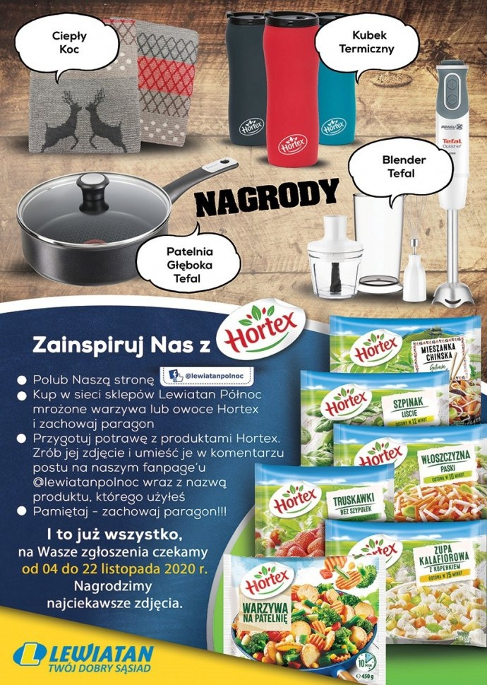 Należy dokonać zakupu produktu marki Hortex z kategorii mrożone warzywa lub owoce w sklepach Polskiej Sieci Handlowej Lewiatan Północ, lista sklepów w załączniku regulaminu.