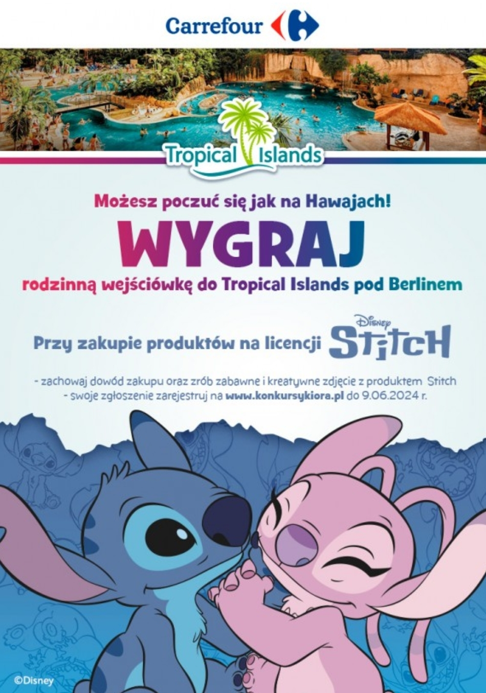 W okresie od dnia 06.05.2024 roku do dnia 09.06.2024 roku w sklepie Carrefour, kup produkt na licencji Disney Stitch i zachowaj dowód zakupu.
