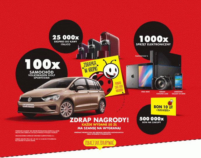 Aby wziąć udział w konkursie należy dokonać w Sklepie Biedronka w okresie od dnia 1 września 2014 r. do dnia 12 października 2014 r. albo do wyczerpania puli Zdrapek w danym Sklepie Biedronka jednorazowego zakupu Produktu Promocyjnego lub Produktów Promocyjnych (tj. potwierdzonego jednym dowodem zakupu) na 50zł